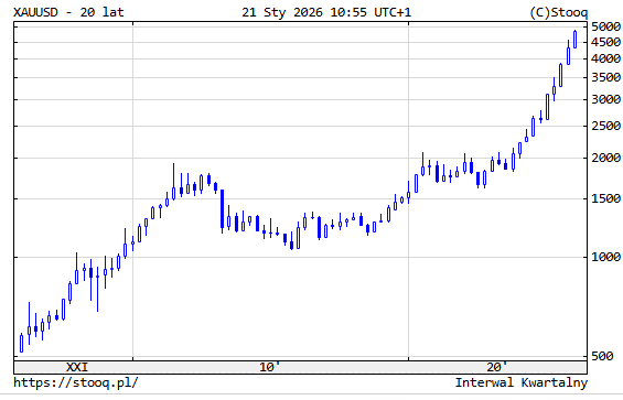 Tłem dla nowych maksimów na kursie złota są rosnące napięcia geopolityczne i handlowe na linii USA–Europa, w tym prawdopodobnie najistotniejszy spór wokół statusu Grenlandii i sygnały o możliwej eskalacji taryf celnych, które podbiły awersję do ryzyka na globalnych rynkach. Wyprzedaż i ucieczka kapitału od tradycyjnych aktywów ma aktualnie miejsce na całym przekroju rynków finansowych – od akcji, przez obligacje skarbowe, po dolara – co dodatkowo działa na korzyść królewskiego metalu, bo słabsza waluta USA zwiększa atrakcyjność złota dla inwestorów spoza Stanów Zjednoczonych.
