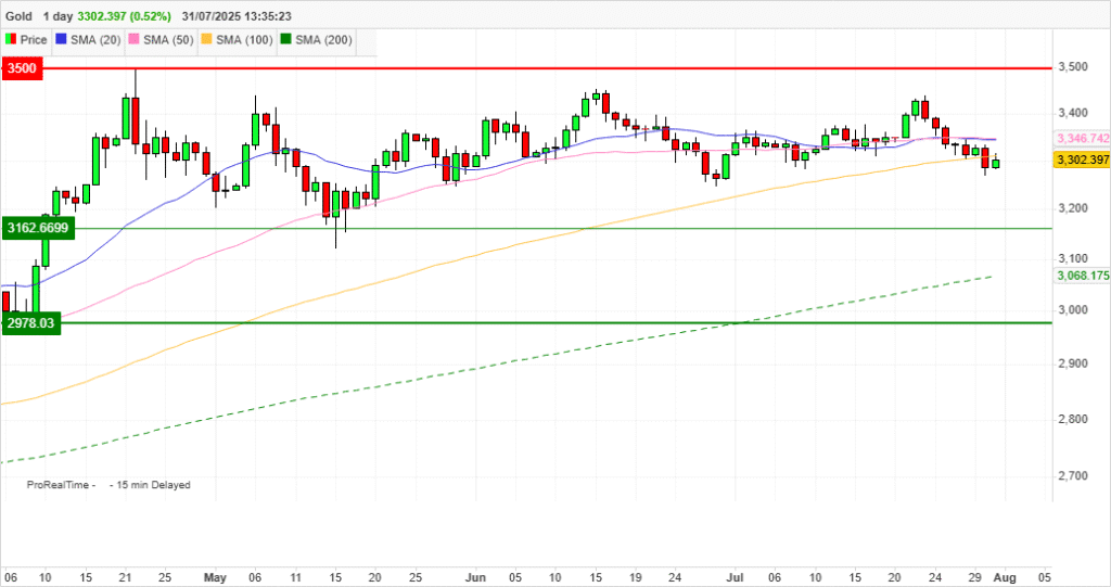 Cena złota znów dała do myślenia inwestorom po środowych wypowiedziach Jerome’a Powella przewodniczącego Rezerwy Federalnej który praktycznie przekreślił nadzieje na obniżkę stóp procentowych we wrześniu. Cena kruszcu spadła do najniższych poziomów sesji osiągając 3271,90 dolara za uncję co oznacza spadek o 1,6 procent w ciągu dnia. Obecnie utrzymuje się lekko poniżej 3300 dolarów, które było również istotnym wsparciem!