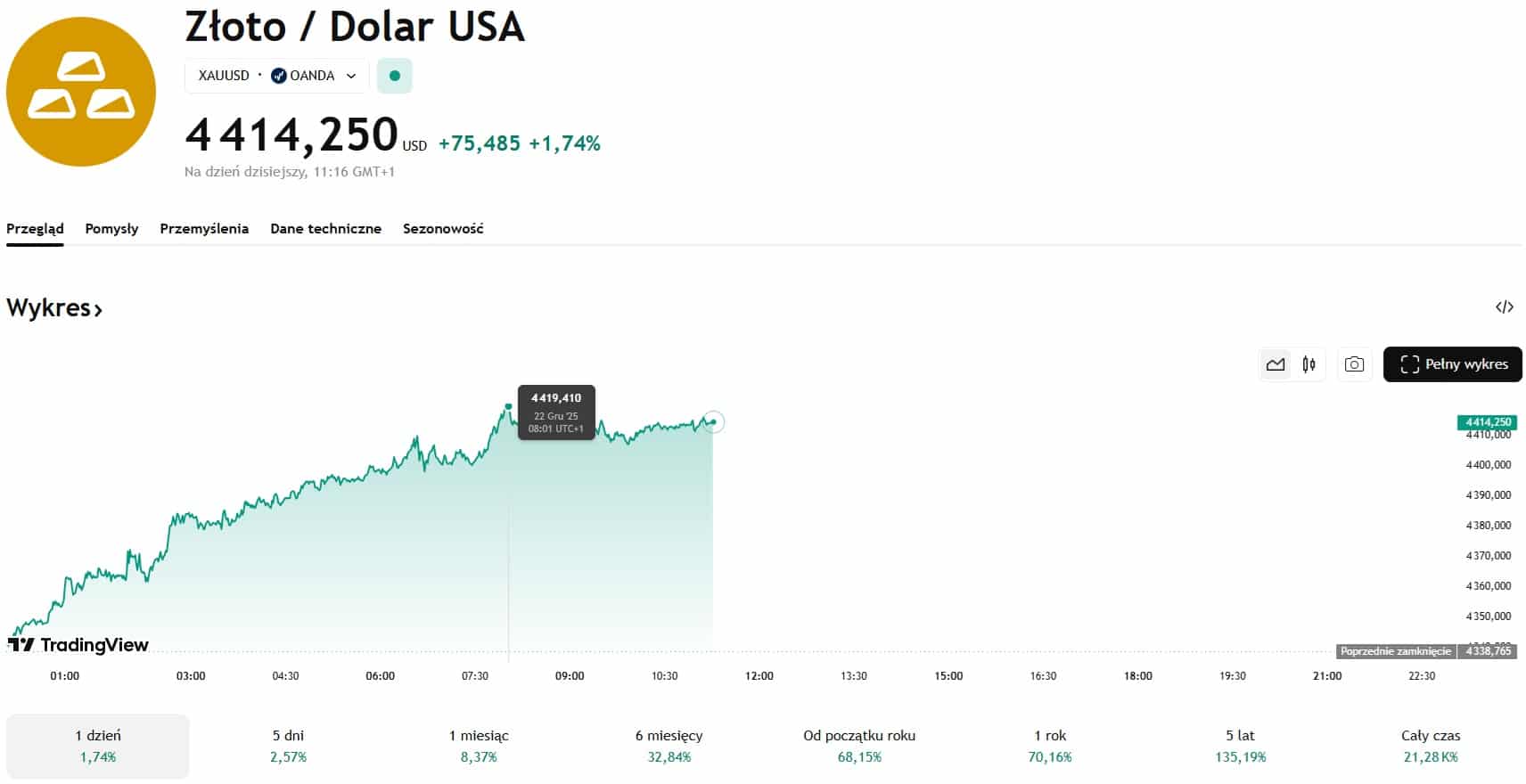 Chociaż po ostatnim szczyscie z października złoto nieco wyhamowało, a nawet zaliczyło drobną korektę, to końcówka roku jest znowu mocna. W zeszłym tygodniu złoty kruszec bardzo zbliżył się do ostateniego rekordu, ale ostatecznie odbił się od tego poziomu. Jednak początek tego tygodnia zaczął się od mocnego akcentu. Kurs złota przekroczył 4419 dolarów za uncję.