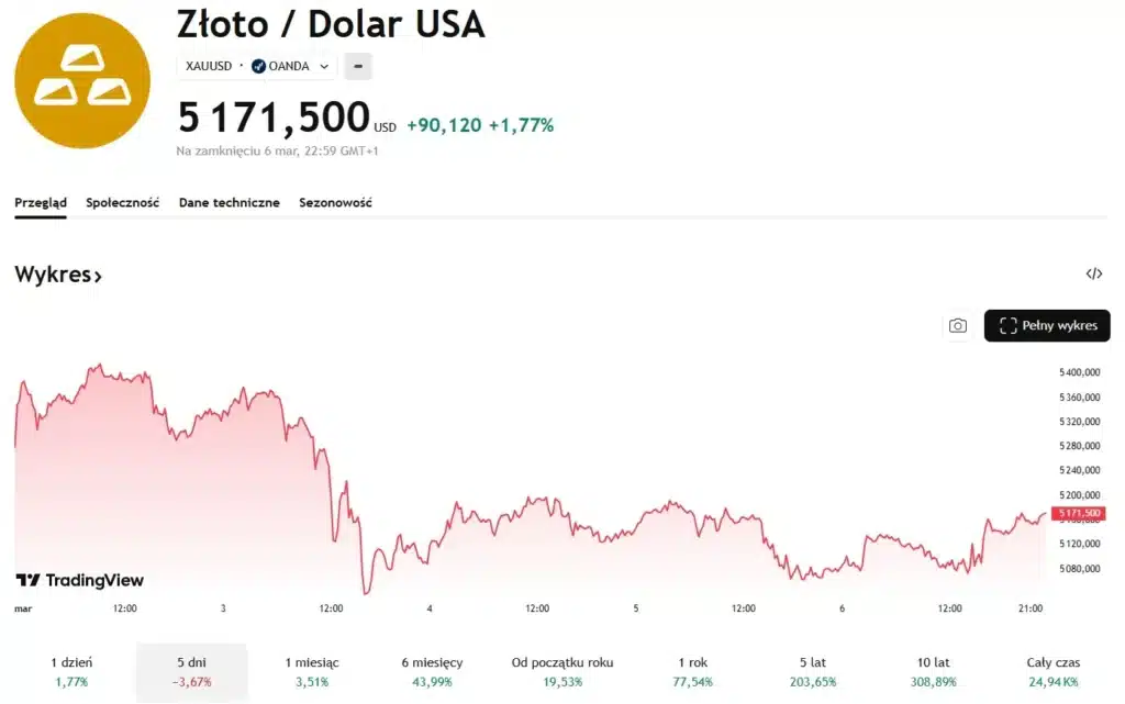 Na koniec tygodnia handlowego między 2 a 6 marca uncja złota kosztowała 5171 dolarów. W piątek kruszec nieco odrobił (1,77%). Jednak cały tydzień metal zakończył ze stratą na poziomie 3,67%. W ujęciu miesięcznym uncja złota podrożała o 3,51%. Natomiast od początku roku (Year To Date) złoty kruszec zyskuje na wartości blisko 20%.