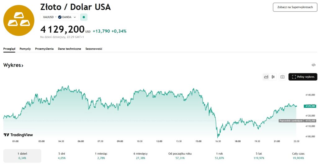 Złoto powoli łapie wiatr w żagle. W chwili pisania tekstu złoto kosztuje 4126 dolarów za uncje, a w ciągu ostatnich 24 godzin zyskało na wartości 0,34%. W ujęciu tygodniowym i miesięcznym metal szlachetny wzrósł odpowiednio o 4,05% oraz 2,78%. Od początku roku metal szlachetny zyskał na wartości aż 57,31%. Kryzys gospodarczy i geopolityczny destabilizuje sytuacje na świecie, ale jak to zwykle bywa, wzmacnia złoto.