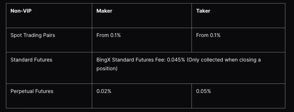 BingX oferuje konkurencyjne i przejrzyste opłaty. Dzięki temu giełda dobrze sprawdza się zarówno u początkujących, jak i bardziej doświadczonych inwestorów. Koszty są jasno określone i łatwe do policzenia.