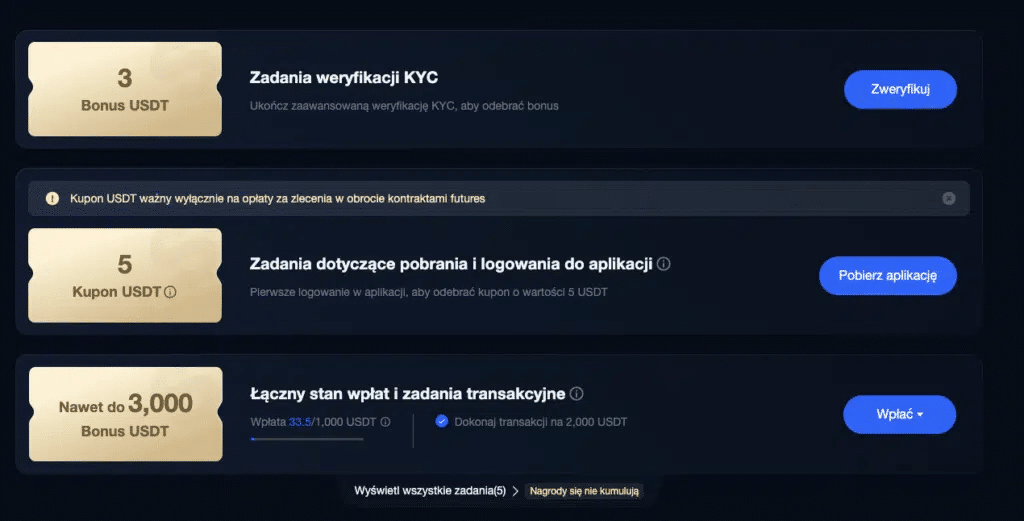Jedna z najbardziej agresywnych giełd pod względem bonusów. Nowi użytkownicy mogą zgarnąć do 8000 USDT, w zależności od aktywności. Wystarczy zarejestrować się z promocyjnego linka, wykonać zadania i rozpocząć handel. Co ważne – nie trzeba przechodzić weryfikacji tożsamości.