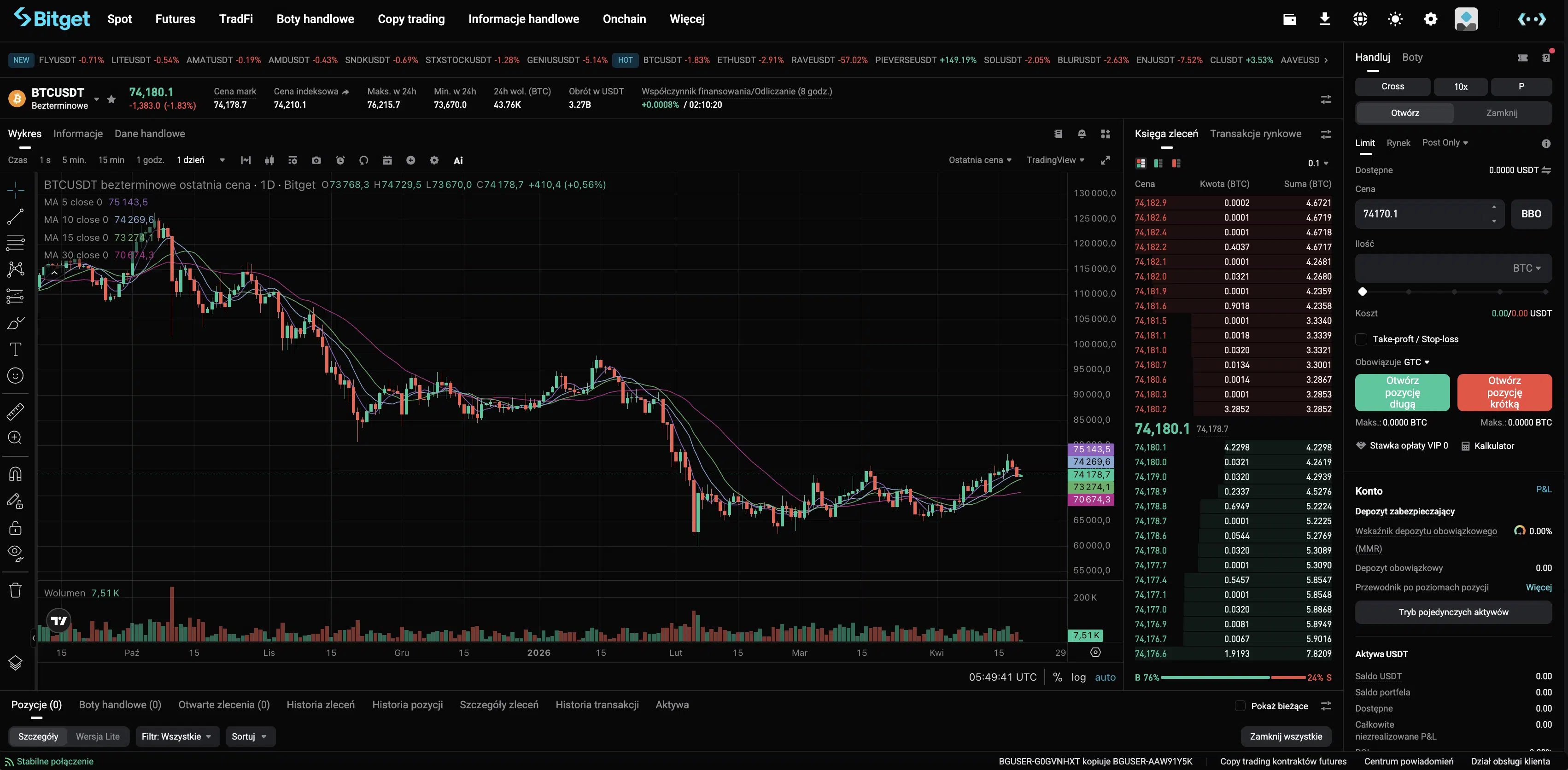 - Order book (księga zleceń) – lista aktualnych zleceń kupna i sprzedaży. Pomaga ocenić popyt i podaż.