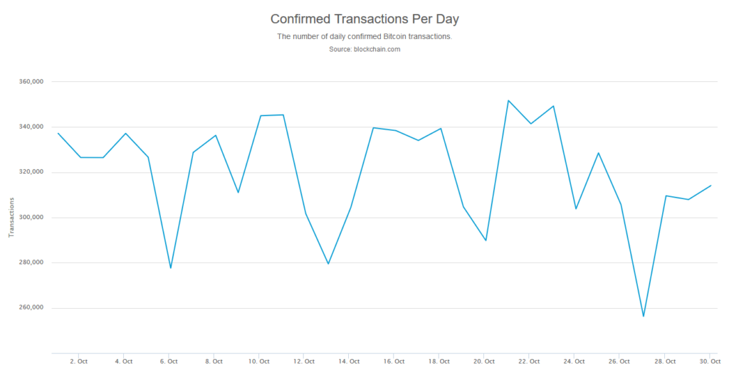 W październiku dzienna ilość transakcji BTC poruszała się właściwie w przedziale 280 000 – 350 000 dziennie.W trzecim tygodniu miesiąca ten zakres zmniejszył się i zawierał między wartościami 288 a 340 tysięcy. 27 października omawiana wartość odnotowała dołek na poziomie 256 000 dziennych transakcji.
