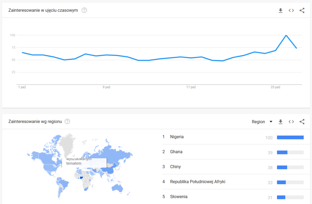Z pewnością nikogo nie zdziwi fakt, że w październiku zainteresowane wyszukiwaniem frazy bitcoin w Google sięgnęło maksymalnej wartości 100 punktów. Co ciekawe, jednym z krajów, które pojawiły się na liście najbardziej zainteresowanych tematem znalazły się Chiny.