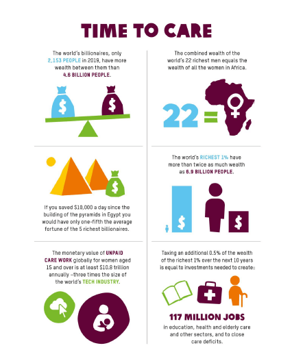 Raport Oxfam zwraca uwagę, że praktycznie całodobowa praca matek i opiekunów nadal pozostaje niedoceniona i opłacana w wymiarze dalekim od oczekiwań. Naukowcy szacują, że wartość nierekompensowanej pracy opiekuńczej wykonywanej przez kobiety w wieku 15 i więcej lat wynosi blisko 10,8 biliona dolarów rocznie.
