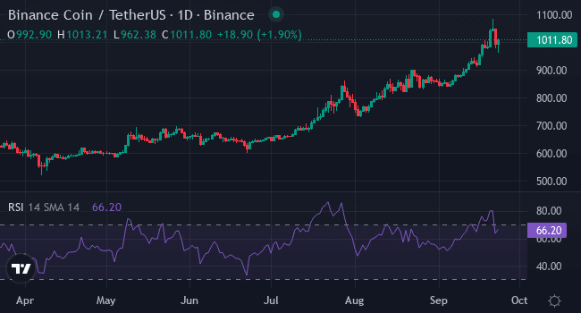 BNB handluje w przedziale 944–1121 USD po gwałtownym wzroście. Token dodał 10,07% w ciągu 7 dni i 15% w miesiąc. W skali 6 miesięcy wzrost sięga 63,69%, przewyższając większość głównych kryptowalut. Cena znajduje się nieco poniżej 10-dniowej średniej (991 USD) i blisko 100-dniowej (1016 USD), co pokazuje stabilną akcję cenową.