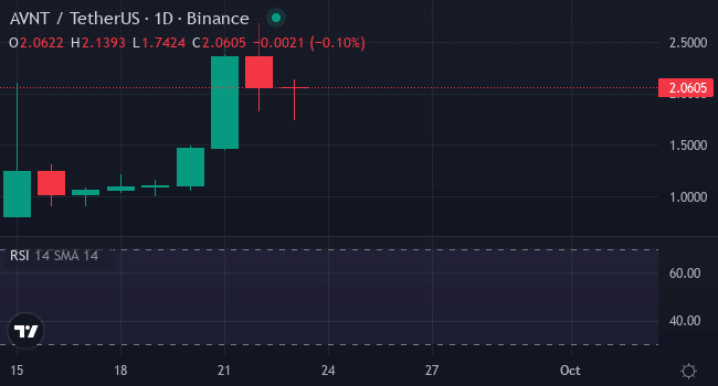 AVNT notuje imponującą passę. Moneta wzrosła o 65,53% w ciągu ostatnich 7 dni i aż o 835,41% zarówno w ostatnim miesiącu, jak i w ciągu 6 miesięcy. Ten rajd przesunął cenę w szeroki przedział 1,27–2,97 USD, utrzymując traderów w gotowości na kolejne wybicie.