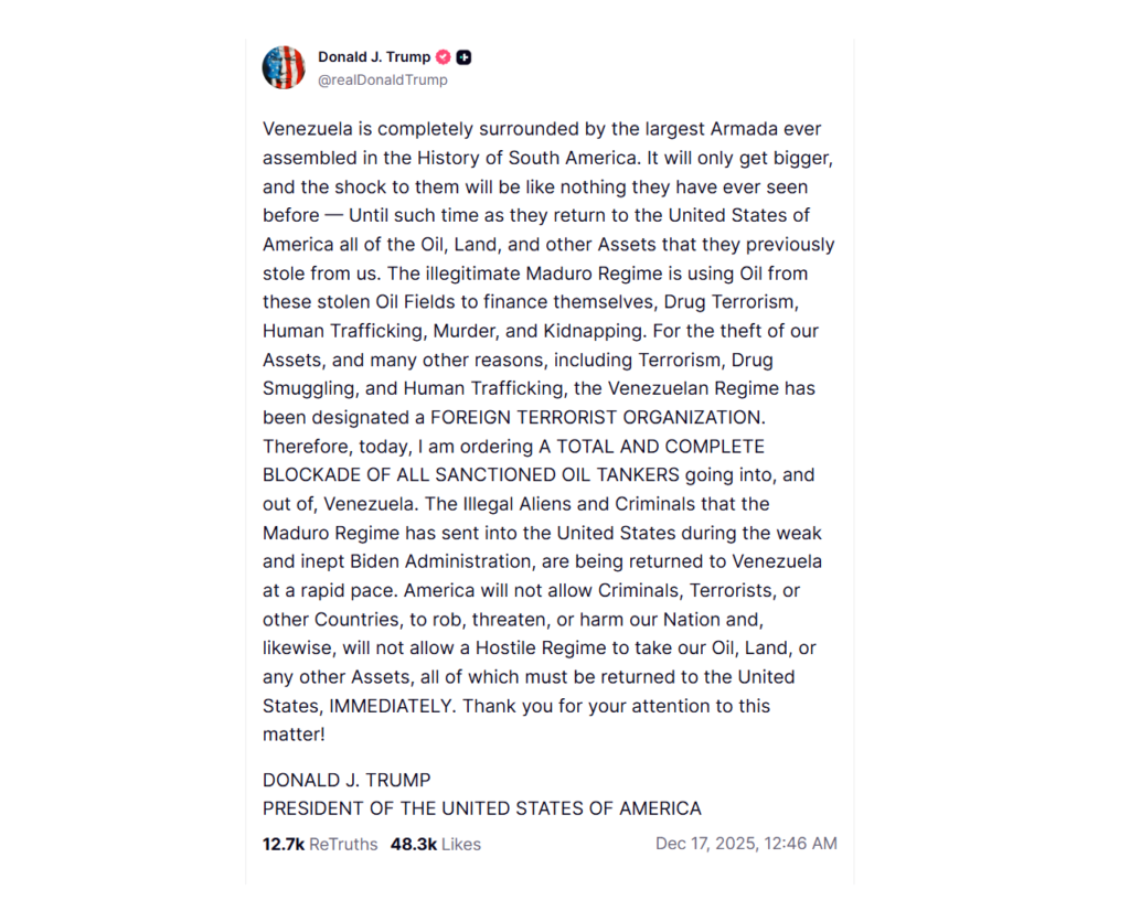 Siły morskie i powietrzne Stanów Zjednoczonych wprowadziły „całkowitą i kompletną” blokadę morską wybrzeży Wenezueli. Całkowitą i kompletną – jednak nie tak całkowicie i kompletnie, blokada koncentruje się bowiem na ruchu morskim służącym obsłudze eksportu i importu głównego bogactwa naturalnego, jakie posiada Wenezuela – ropy naftowej. Taki rozwój wypadków był do przewidzenia był już w ubiegłym tygodniu, gdy amerykańskie organy zajęły tankowiec transportujący wenezuelską ropę.