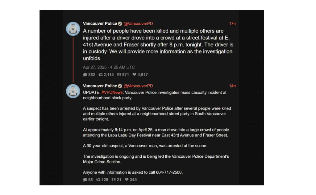 W niedzielę wieczorem w Vancouver, w Kanadzie, doszło do ataku terrorystycznego. W trakcie odbywającego się właśnie festiwalu kultury filipińskiej Lapu Lapu, w tłum uczestników z dużą prędkością wjechał SUV, taranując zgromadzonych. Zginęło co najmniej 11 osób. Zamachowca schwytano. Zamach z miejsca okazał się rozbudzić oskarżenia i kontrowersje – tym bardziej, że wydarzył się w wyjątkowo wrażliwym momencie.