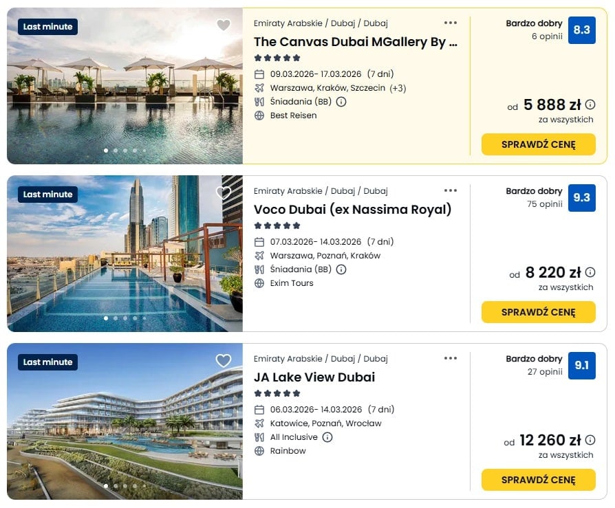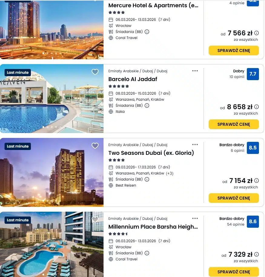 Z moich ustaleń wynika, że oferty wyjazdów do Dubaju nadal są aktywnie sprzedawane, mimo pojawiających się informacji o zakłóceniach lotów i zagrożeniach bezpieczeństwa. Dlatego sprawa przestaje być indywidualnym sporem, a staje się pytaniem o standard ochrony polskich turystów. Poniżej przedstawiam zrzuty ekranu z portalu wakacje.pl, które wykonałem dzisiaj (posiadam oryginalne zdjęcia z metadanymi).