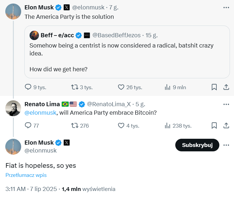 Fiat jest beznadziejny – tak, bez ceregieli, Elon Musk podsumował przyszłość tradycyjnych walut. Ten sam Elon, który dwa dni temu odpalił swój nowy polityczny wehikuł o nazwie America Party. Czy to początek czegoś większego, czy tylko kolejna krótka polityczna burza z Muskiem w roli głównej? Na razie wiadomo tyle, że będzie ciekawie, także w kontekście kryptowalut. Nawet jeśli dla Elona to tylko świetna zabawa.