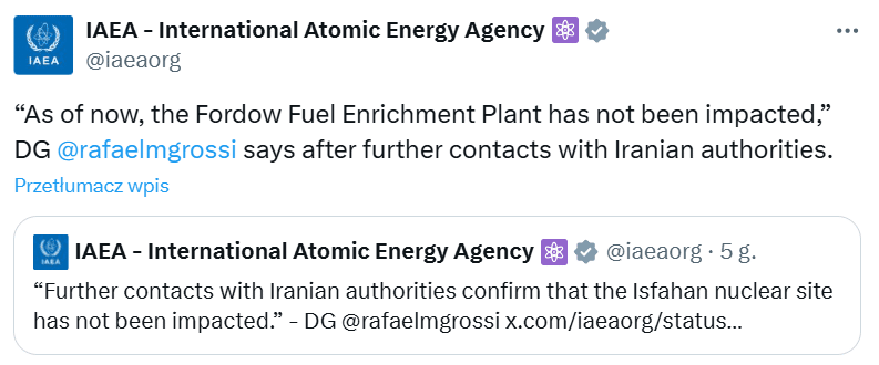 Równolegle, Międzynarodowa Agencja Energii Atomowej potwierdziła, że inne ośrodki – w tym Fordo i Buszehr – nie zostały zbombardowane. IAEA potwierdziła, że Natanz rzeczywiście został trafiony, lecz inne instalacje pozostają nienaruszone, a poziomy promieniowania nie wzrosły. Teoretycznie jest to organizacja niezależna, ale w praktyce… bywa różnie. Tam też różne kraje mają swoje wpływy, z Iranem i Izraelem włącznie. Szef IAEA, Rafael Grossi, zapowiedział gotowość osobistej wizyty, by ocenić sytuację.