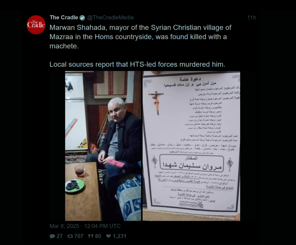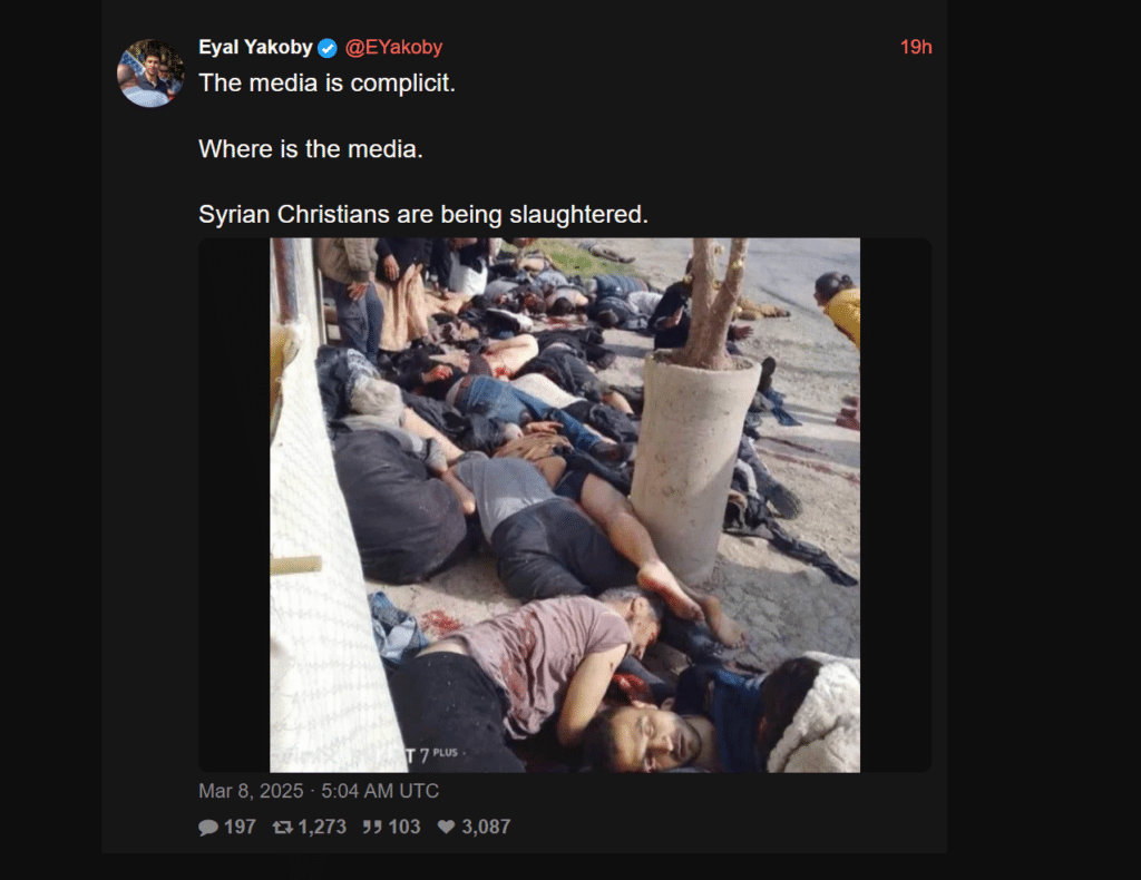 Ad rem – muzułmańskie bojówki rządowe dokonały w ostatnich dniach masakr ludności cywilnej w północno-zachodniej Syrii. Bojówki te oficjalnie stanowią „siły bezpieczeństwa” rządu tymczasowego – ciężko mówić tu jednak o jakimkolwiek bezpieczeństwie przezeń zapewnianym, biorąc pod uwagę fakt, że sam rząd został stworzony przez koalicję skrajnie islamistycznych, terrorystycznych ugrupowań Haj’jat Tahrir asz-Szam.