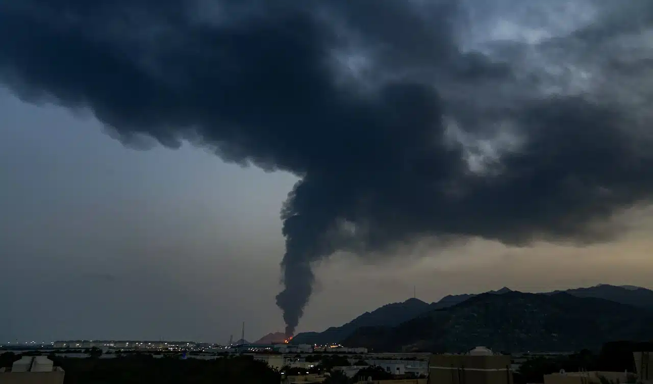 - Irański pocisk balistyczny trafił bezpośrednio w rafinerię Bapco w Bahrajnie, powodując pożar instalacji przetwórczych. Nagranie z monitoringu przemysłowego pokazuje kolumnę czarnego dymu unoszącą się nad kompleksem; obiekt stanowił kluczowy element dostaw ropy na rynki międzynarodowe.