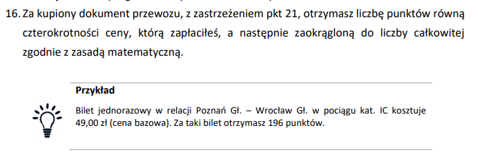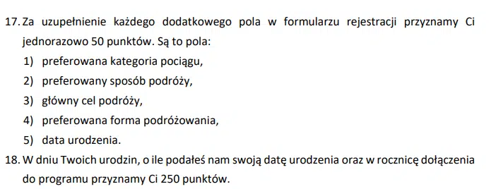Kolejne punkty można zdobywać poprzez zakup biletów – 4 punkty za każdą wydaną złotówkę. Tak więc przykładowo, przy zakupie biletu za 49zł, na konto wpadnie 196 punktów. Co warto zaznaczyć, punkty można będzie wykorzystać dopiero, gdy termin ważności biletu minie. Punkty będą ważne przez 24 miesiące od momentu zakupu biletu. Przewoźnik dopuszcza także opcję odszkodowania za opóźniony czy odwołany przejazd w formie punktów. Przykładowo, za opóźnienie przekraczające dwie godziny, jeśli zakupiliście bilet za 80 złotych, to zyskacie 4800 punktów. Oczywiście, ta opcja jest dobrowolna i można wybrać odszkodowanie wypłacane w gotówce.