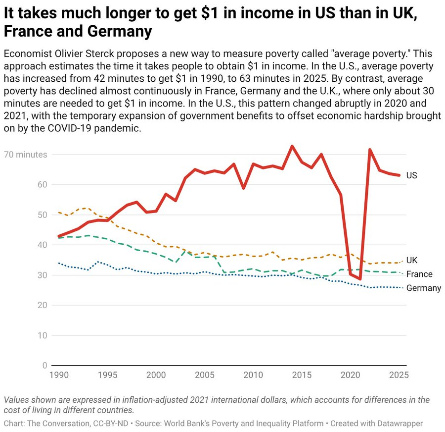 Dla porównania: w Niemczech wystarczy 26 minut, we Francji 31, a w Wielkiej Brytanii 34. Różnica jest brutalna. „Średnie ubóstwo” w Stanach Zjednoczonych okazuje się niemal dwukrotnie wyższe niż w największych gospodarkach Europy.