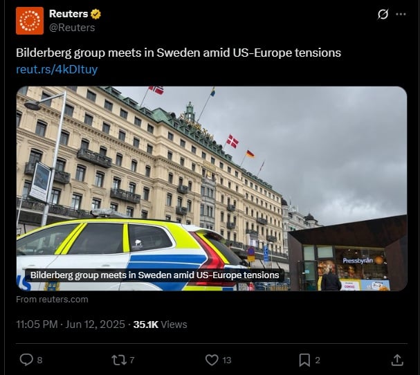 Kontrowersyjna grupa Bilderberg w czwartek spotkała się w szwedzkim Grand Hotel, by przedyskutować aktualne problemy polityczne i gospodarcze. Prawdopodobnie jednym z głównych wątków trzydniowego spotkania światowych elit, będzie napięta sytuacja między USA a Europą oraz Chinami. Można przypuszczać, że ważnym tematem będzie również zakończenie konfliktu zbrojnego między Rosją i Ukrainą.