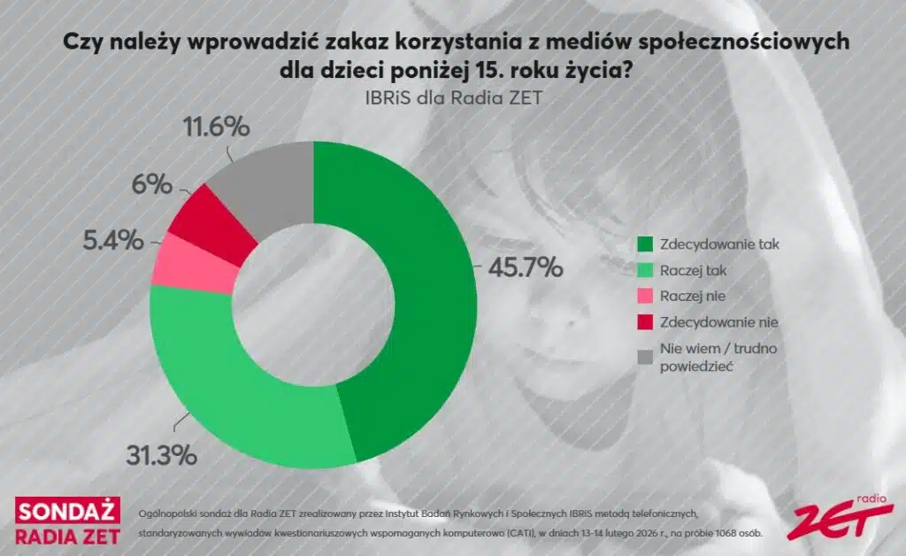 Rzadko się zdarza, że obywatele są tak jednomyślni w jakiekolwiek sprawie, jak w przypadku ograniczeń na dostęp do mediów społecznościowych. Z sondażu IBRiS, która firma przeprowadziła na zlecenie Radia ZET, wynika, że 77% respondentów ocenia zakaz korzystania z social mediów dla osób poniżej 15 roku życia jako dobry. Odmienne zdanie ma 11,4% ankietowanych, a 11,6% nie ma zdania na ten temat.