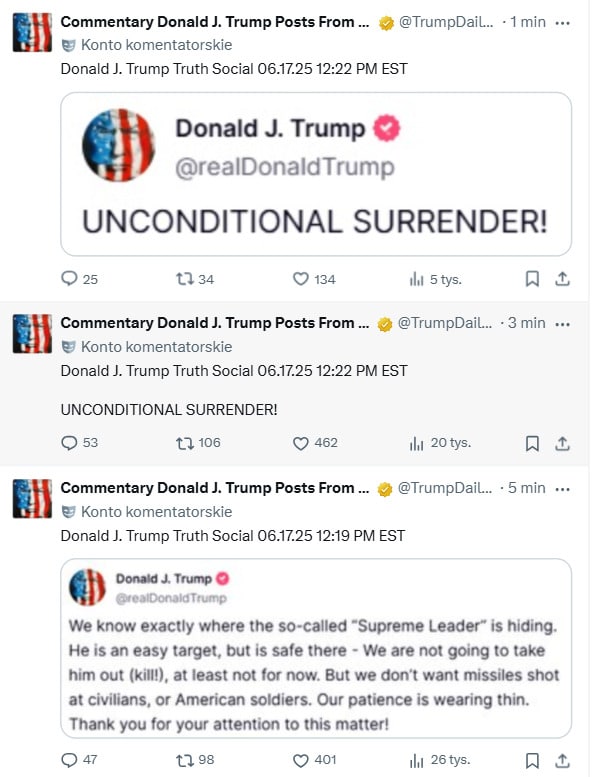 Były prezydent Donald Trump opublikował na Truth Social alarmujące oświadczenie. W nim zaapelował o „bezwzględną kapitulację” i zagroził dalszymi konsekwencjami wobec Iranu. Stwierdził, że „dokładnie wiadomo, gdzie ukrywa się tzw. Najwyższy Przywódca Iranu”. Określił go jako „łatwy cel” — jednak dodał, że nie zostanie on zaatakowany… Przynajmniej na razie. Trump zaznaczył, że cierpliwość USA się kończy, zwłaszcza wobec ataków rakietowych na ludność cywilną i amerykańskich żołnierzy.
