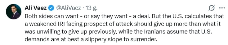 Ekspert Ali Vaez z Crisis Group wskazał w serwisie X że tak potężna mobilizacja sił ma na celu odstraszenie Teheranu przed wykonaniem pierwszego ruchu przy jednoczesnym potęgowaniu izolacji dyplomatycznej kraju.