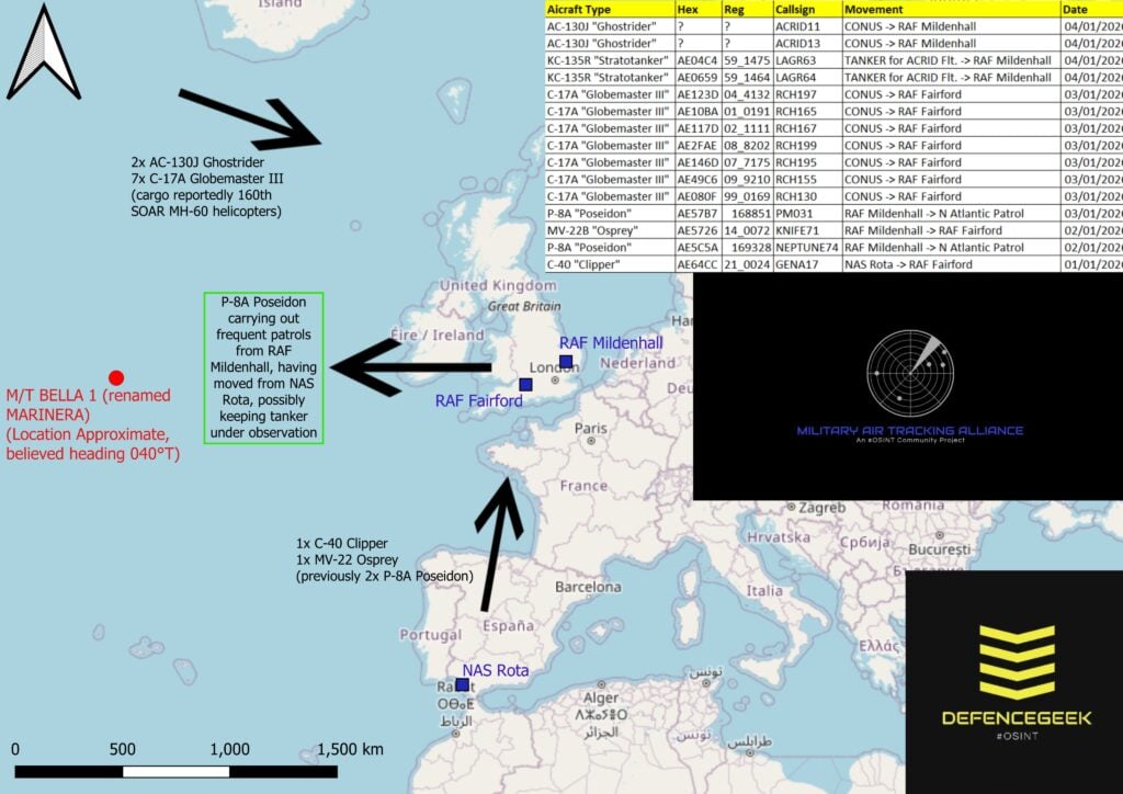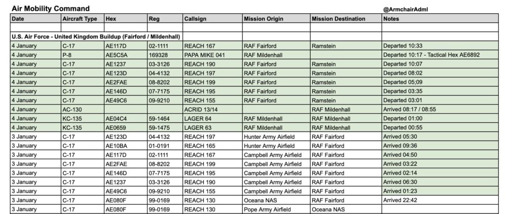 W ciągu kilkudziesięciu godzin odnotowano przeloty i lądowania ponad dziesięciu samolotów transportowych C-17A Globemaster III, co najmniej dwóch powietrznych tankowców KC-135 Stratotanker oraz dwóch maszyn wsparcia ogniowego AC-130J Ghostrider. C-17 to kręgosłup amerykańskiej logistyki strategicznej, zdolny do przewozu żołnierzy, śmigłowców, pojazdów oraz ciężkiego wyposażenia.