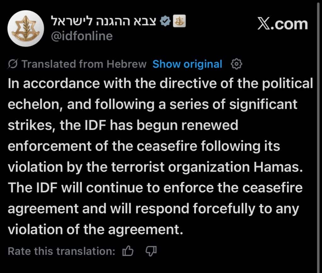 Zgodnie z dyrektywami szczebla politycznego i po serii znaczących ataków, Siły Obronne Izraela poinformowały dziś, że rozpoczęły ponowne egzekwowanie zawieszenia broni po jego złamaniu przez organizację terrorystyczną Hamas. Siły Obronne Izraela będą nadal egzekwować porozumienie o zawieszeniu broni i zareagują stanowczo na jakiekolwiek jego naruszenie. Dziś, w wywiadzie na łamach Fox News, Trump przekazał, że Izrael może zostać zmuszony do rozbrojenia Hamasu.