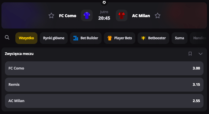 Wszystko układa się pod kolejny podział punktów. Milan jest mistrzem „nieprzegrywania”, Como mistrzem „nieodpuszczania” u siebie. Dodatkowo dwa ostatnie mecze Milanu kończyły się wynikiem 1:1, a Como już czterokrotnie remisowało w tym sezonie właśnie w takim stylu. To spotkanie aż prosi się o wynik, który nikogo nie zadowoli w pełni, ale nikogo też nie pogrąży. Nie trzeba dodawać, że kurs – jak to na remis – zawsze jest zachęcający.