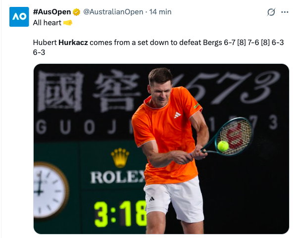 To, podobnie jak wczoraj w przypadku Igi Świątek, nie był spokojny spacer po pierwszej rundzie Australian Open. Hubert Hurkacz zrobił jednak dokładnie to, co w turniejach wielkoszlemowych jest najważniejsze, czyli przetrwał trudny moment i zameldował się w drugiej rundzie. Polak po ponad trzech godzinach bardzo wymagającej walki pokonał Zizou Bergsa 6:7(6), 7:6(6), 6:3, 6:3. Wynik wygląda solidnie, ale przebieg meczu był znacznie bardziej nerwowy, niż sugeruje sucha statystyka.