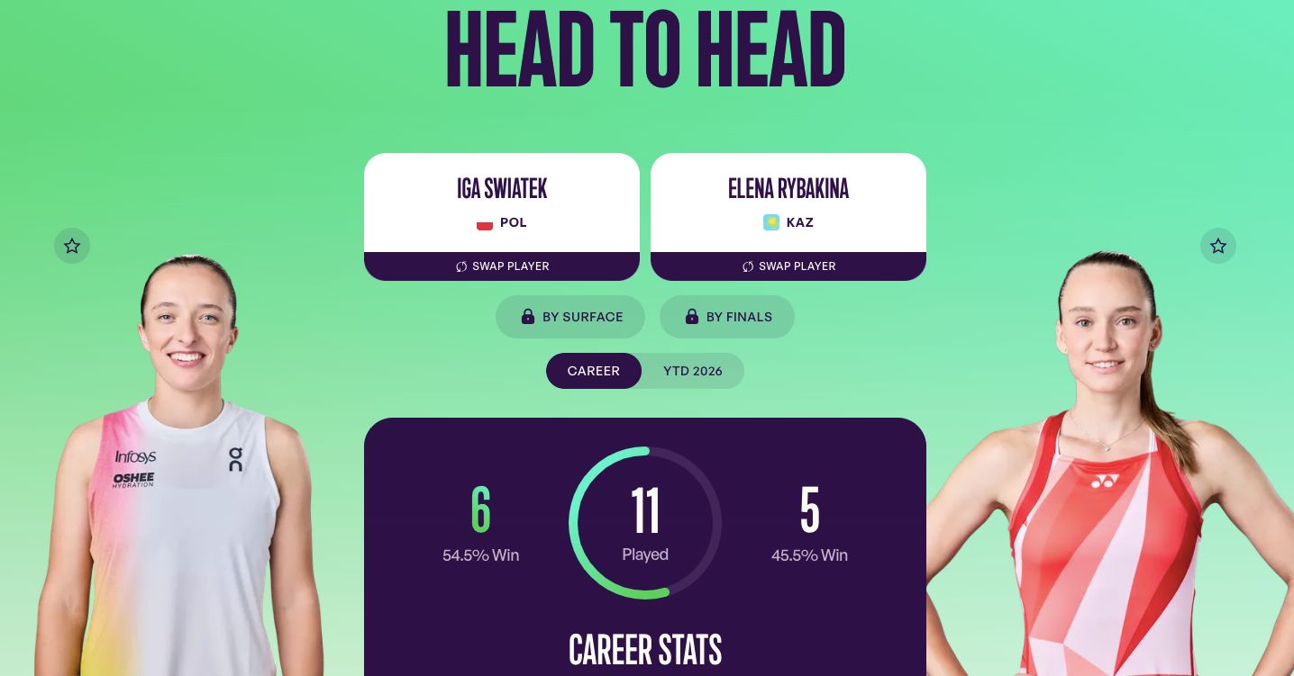 Iga Świątek i Rybakina jak do tej pory spotkały się jedenastokrotnie. Rekord jest niemal równy dla obu zawodniczek. Sześć razy zwyciężała Polka, pięć jej najbliższa rywalka. Ostatni raz panie spotkały się na kortach WTA Finals w Arabii Saudyjskiej, gdzie pod koniec 2025 roku górą była Rybakina. Niemniej jednak cztery poprzednie pojedynki – w 2024 i 2025 roku – wygrywała Świątek. W tym w 1/16 finału innego wielkoszlemowego turnieju – French Open.