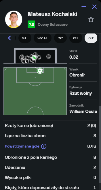 Mimo porażki 1:6, Mateusz Kochalski z pewnością ma powody do zadowolenia. Reprezentant Polski według portalu Sofascore był najlepszym zawodnikiem Karabachu, notując ocenę 7.0. Polak wybronił aż osiem strzałów, zdecydowanie pomagając w uniknięciu jeszcze wyższej porażki.
