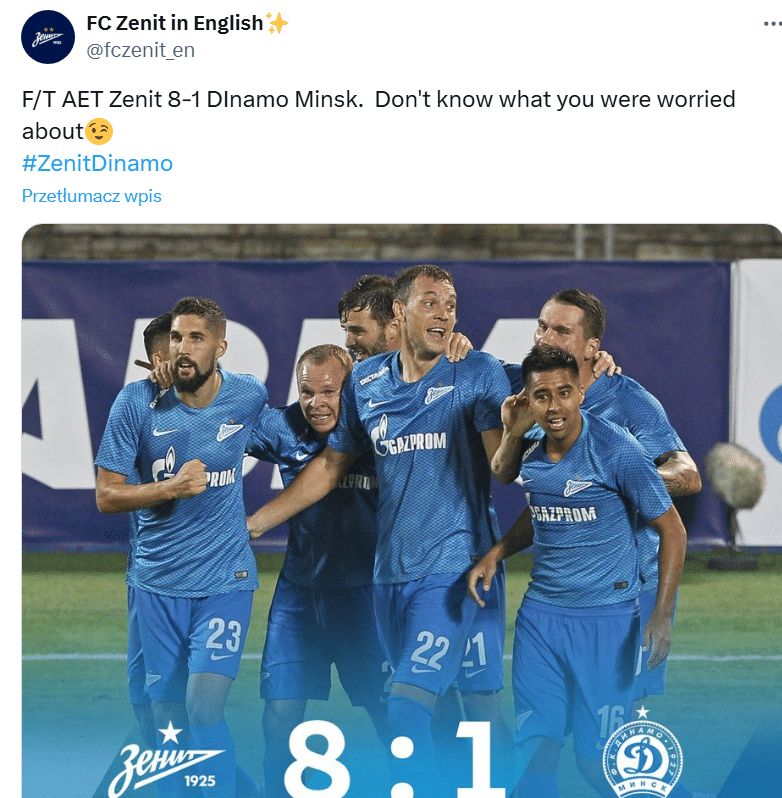 Jeszcze bardziej widowiskowy rewanż miał miejsce w eliminacjach 2018/19. Dokładnie w tej samej fazie LE, w której teraz gra Legia. Zenit po porażce 0:4 z Dinamo Mińsk w pierwszym meczu u siebie wygrał… 8:1 po dogrywce. Rosjanie musieli odrobić cztery gole, grali w osłabieniu, a mimo to zdołali odwrócić losy rywalizacji w sposób wręcz nieprawdopodobny.