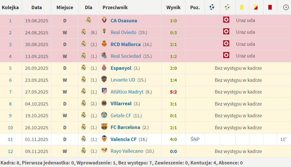 To klasyczny problem młodego „cracka” – błysk kontra taktyka. A Madryt to miejsce, gdzie błysk nie wystarczy, jeśli nie grasz jak maszyna. Na jego nieszczęście, kontuzja uda w maju wykluczyła go z Klubowych Mistrzostw Świata, a potem z początku sezonu. Kiedy wrócił, pociąg już odjechał.