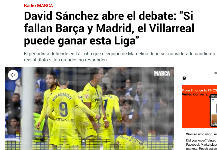 W hiszpańskich mediach pojawiła się teza, która jeszcze miesiąc temu brzmiałaby jak żart opowiedziany pod wpływem przy barze. Villarreal może grać o mistrzostwo LaLiga. I nie chodzi o internetowe fantazje kibiców ani viralowe tweety, tylko o opinię dwóch osób, które w Hiszpanii mają prawo mówić o futbolu głośno – Davida Sáncheza i Santiego Cañizaresa.