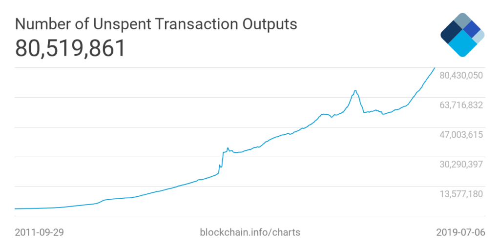 Dwa ostatnie aspekty, w których sieć Bitcoin odnotowuje największą dotychczas osiągniętą miarę wielkości to blockchain i niewydane transakcje wyjściowe (UTXO).