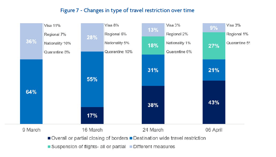 Poziom restrykcji zawiera się pomiędzy całkowitym lub częściowym zamknięciem granic dla turystów do ograniczeń uwarunkowanych celem podróży. UNWTO informuje, że szczytem ograniczeń jest całkowite lub częściowe zawieszenie lotów.